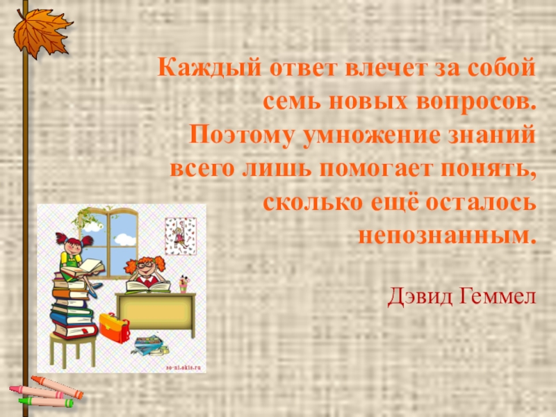 Каждый ответ влечет за собой семь новых вопросов. Поэтому умножение знаний всего лишь помогает понять, сколько ещё осталось непознанным. Дэвид Геммел