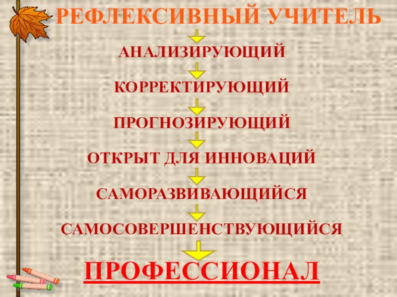 РЕФЛЕКСИВНЫЙ УЧИТЕЛЬАНАЛИЗИРУЮЩИЙКОРРЕКТИРУЮЩИЙПРОГНОЗИРУЮЩИЙОТКРЫТ ДЛЯ ИННОВАЦИЙСАМОРАЗВИВАЮЩИЙСЯСАМОСОВЕРШЕНСТВУЮЩИЙСЯПРОФЕССИОНАЛ