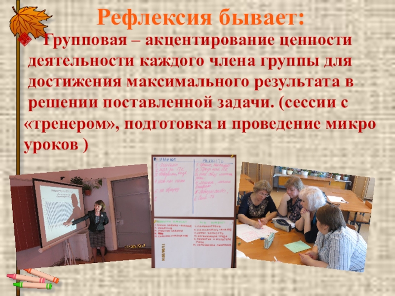 Рефлексия бывает: Групповая – акцентирование ценности деятельности каждого члена группы для достижения максимального результата в решении поставленной
