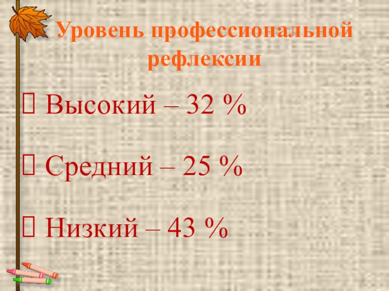 Уровень профессиональной рефлексии Высокий – 32 % Средний – 25 % Низкий – 43 %