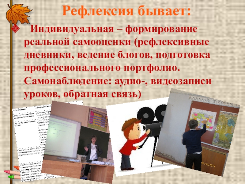 Рефлексия бывает: Индивидуальная – формирование реальной самооценки (рефлексивные дневники, ведение блогов, подготовка профессионального портфолио. Самонаблюдение: аудио-, видеозаписи