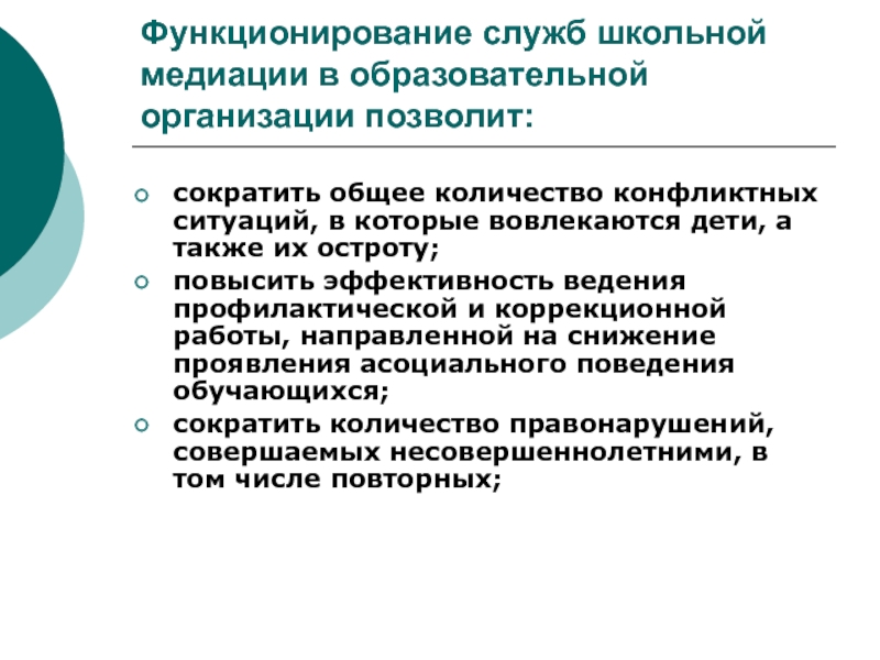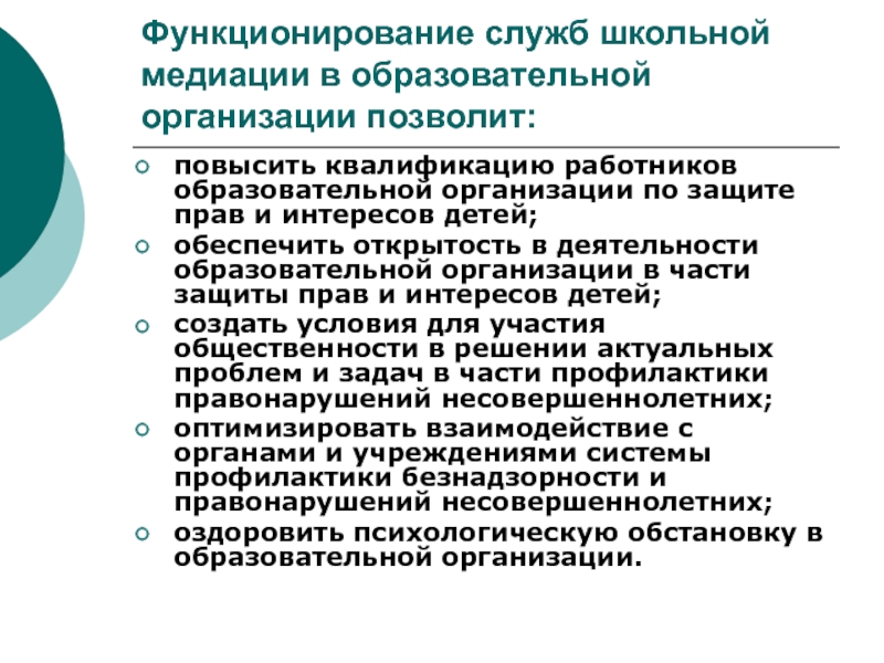 Слайд 7Функционирование служб школьной медиации в образовательной организации позволит:
