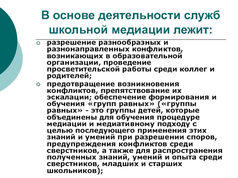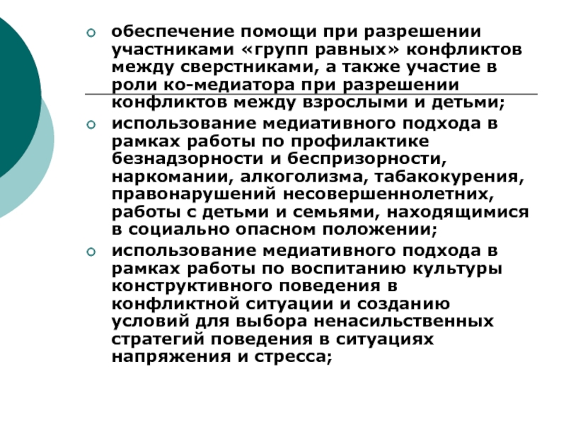 предотвращение возникновения конфликтов, препятствование их эскалации; обеспечение формирования и обучения «групп равных» («группы равных» - это группы детей, которые объединены для обучения процедуре медиации и медиативному подходу с целью последующего применения этих знаний и умений при разрешении споров, предупреждения конфликтов среди сверстников, а также для распространения полученных знаний, умений и опыта среди сверстников, младших и старших школьников);