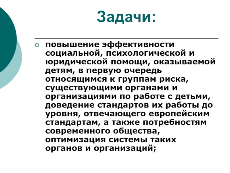 очередь относящимся к группам риска, существующими органами и организациями по работе с детьми, доведение стандартов их работы до уровня, отвечающего европейским стандартам, а также потребностям современного общества, оптимизация системы таких органов и организаций;