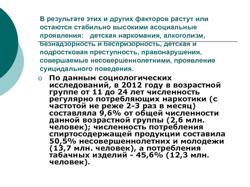 По данным социологических исследований, в 2012 году в возрастной группе от 11 до 24 лет численность регулярно потребляющих наркотики (с частотой не реже 2-3 раз в месяц) составляла 9,6% от общей численности данной возрастной группы (2,6 млн. человек); численность потребления спиртосодержащей продукции составила 50,5% несовершеннолетних и молодежи (13,7 млн. человек), а потребления табачных изделий - 45,6% (12,3 млн. человек).