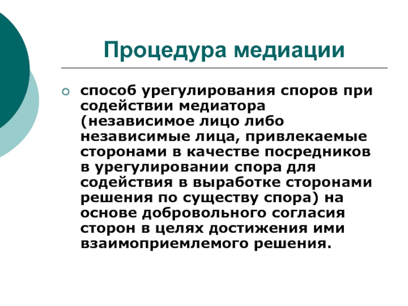 независимые лица, привлекаемые сторонами в качестве посредников в урегулировании спора для содействия в выработке сторонами решения по существу спора) на основе добровольного согласия сторон в целях достижения ими взаимоприемлемого решения.