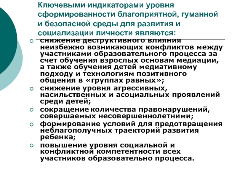 Слайд 19Ключевыми индикаторами уровня сформированности благоприятной, гуманной и безопасной среды для развития