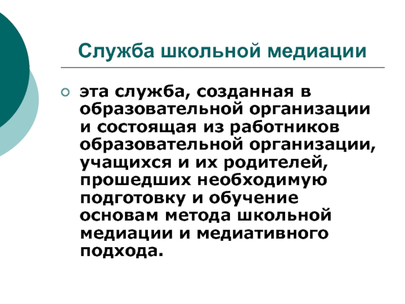 из работников образовательной организации, учащихся и их родителей, прошедших необходимую подготовку и обучение основам метода школьной медиации и медиативного подхода.