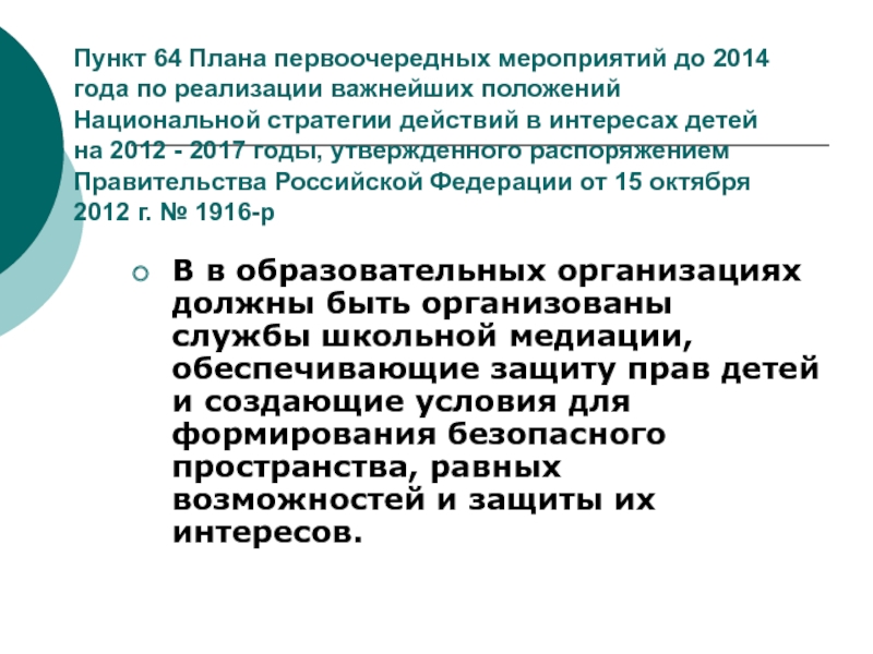 В в образовательных организациях должны быть организованы службы школьной медиации, обеспечивающие защиту прав детей и создающие условия для формирования безопасного пространства, равных возможностей и защиты их интересов.