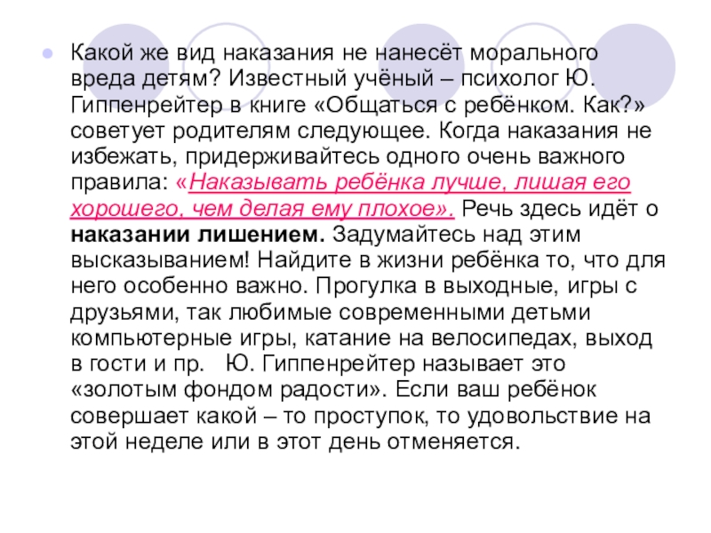 – психолог Ю. Гиппенрейтер в книге «Общаться с ребёнком. Как?» советует родителям следующее. Когда наказания не избежать, придерживайтесь одного очень важного правила: «Наказывать ребёнка лучше, лишая его хорошего, чем делая ему плохое». Речь здесь идёт о наказании лишением. Задумайтесь над этим высказыванием! Найдите в жизни ребёнка то, что для него особенно важно. Прогулка в выходные, игры с друзьями, так любимые современными детьми компьютерные игры, катание на велосипедах, выход в гости и пр. Ю. Гиппенрейтер называет это «золотым фондом радости». Если ваш ребёнок совершает какой – то проступок, то удовольствие на этой неделе или в этот день отменяется.
