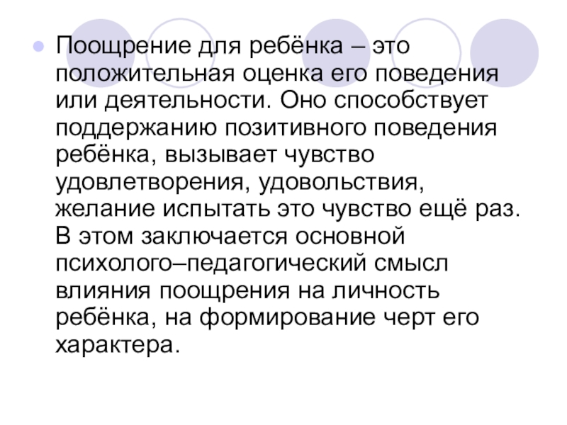Оно способствует поддержанию позитивного поведения ребёнка, вызывает чувство удовлетворения, удовольствия, желание испытать это чувство ещё раз. В этом заключается основной психолого–педагогический смысл влияния поощрения на личность ребёнка, на формирование черт его характера.