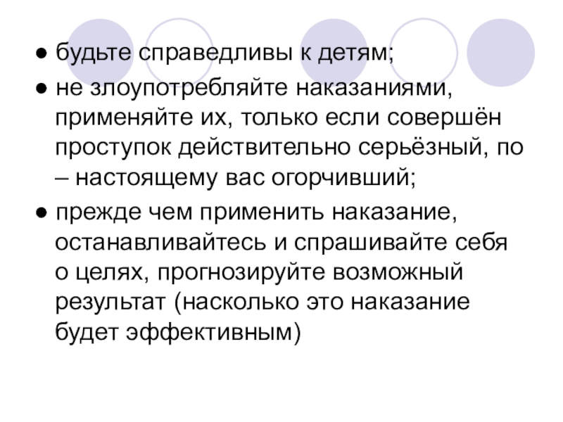 ● прежде чем применить наказание, останавливайтесь и спрашивайте себя о целях, прогнозируйте возможный результат (насколько это наказание будет эффективным)