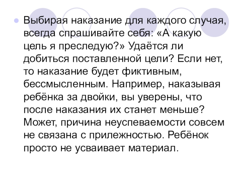 Слайд 18Выбирая наказание для каждого случая, всегда спрашивайте себя: «А какую цель