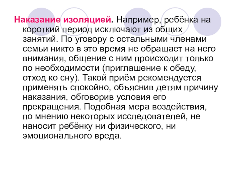 Слайд 14Наказание изоляцией. Например, ребёнка на короткий период исключают из общих занятий.