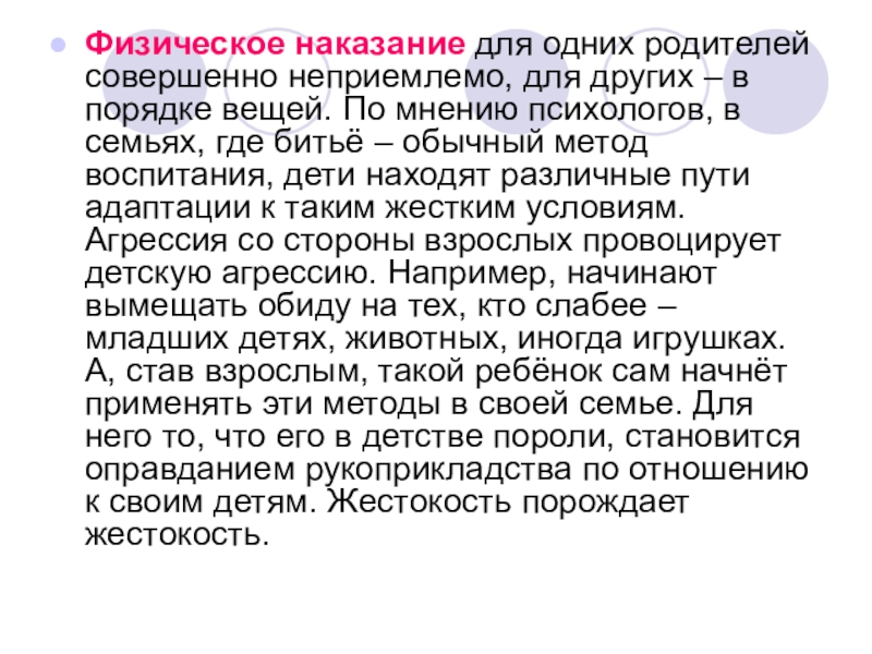 порядке вещей. По мнению психологов, в семьях, где битьё – обычный метод воспитания, дети находят различные пути адаптации к таким жестким условиям. Агрессия со стороны взрослых провоцирует детскую агрессию. Например, начинают вымещать обиду на тех, кто слабее – младших детях, животных, иногда игрушках. А, став взрослым, такой ребёнок сам начнёт применять эти методы в своей семье. Для него то, что его в детстве пороли, становится оправданием рукоприкладства по отношению к своим детям. Жестокость порождает жестокость.