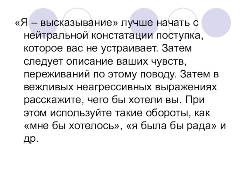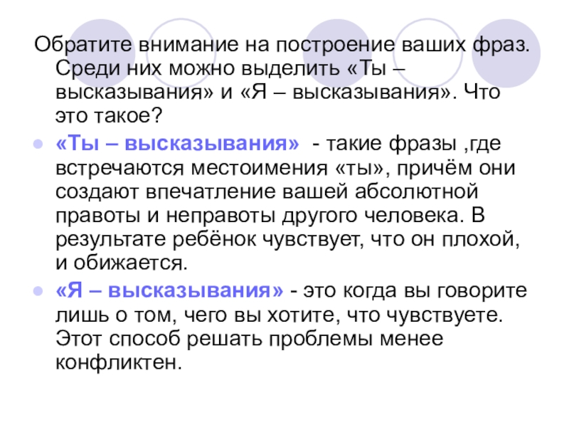 «Я – высказывания» - это когда вы говорите лишь о том, чего вы хотите, что чувствуете. Этот способ решать проблемы менее конфликтен.