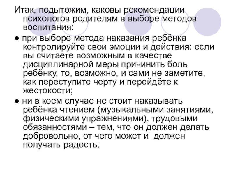 Слайд 19Итак, подытожим, каковы рекомендации психологов родителям в выборе методов воспитания: