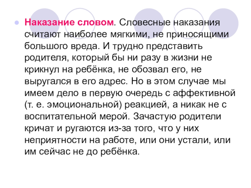 Слайд 9Наказание словом. Словесные наказания считают наиболее мягкими, не приносящими большого вреда.