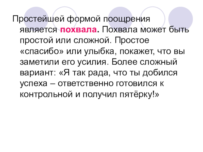 Слайд 23Простейшей формой поощрения является похвала. Похвала может быть простой или сложной.