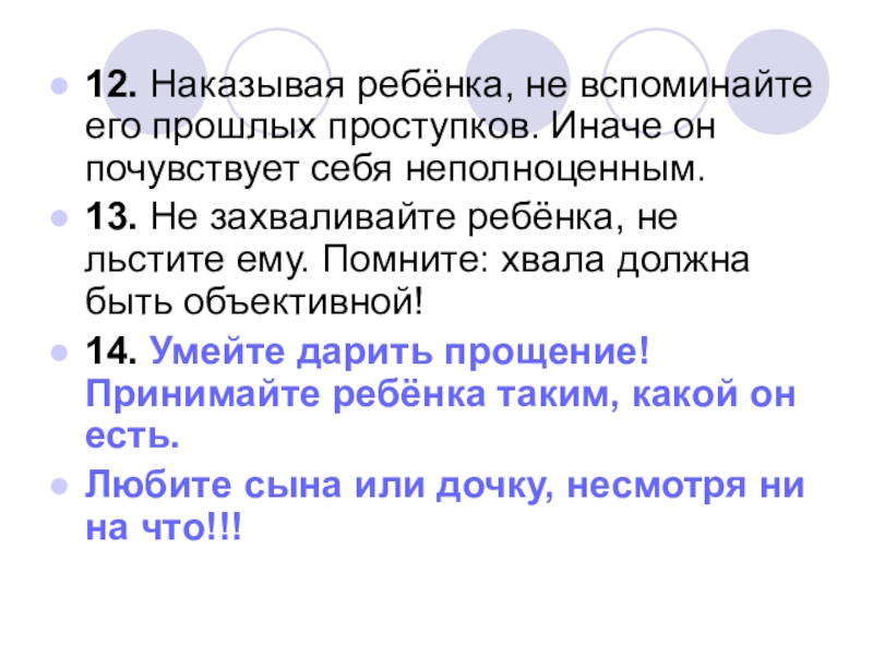 Слайд 3112. Наказывая ребёнка, не вспоминайте его прошлых проступков. Иначе он почувствует