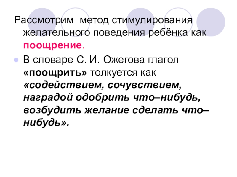 Слайд 21Рассмотрим метод стимулирования желательного поведения ребёнка как поощрение.