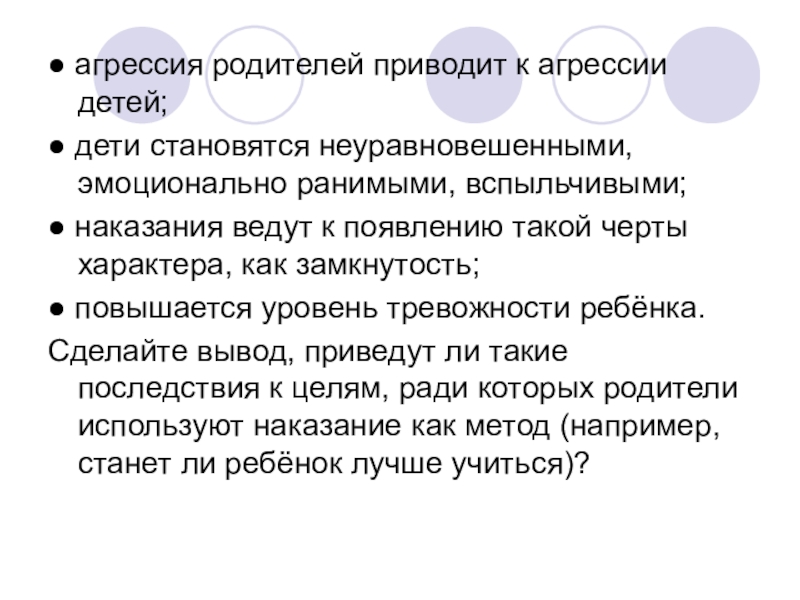 Слайд 8● агрессия родителей приводит к агрессии детей;