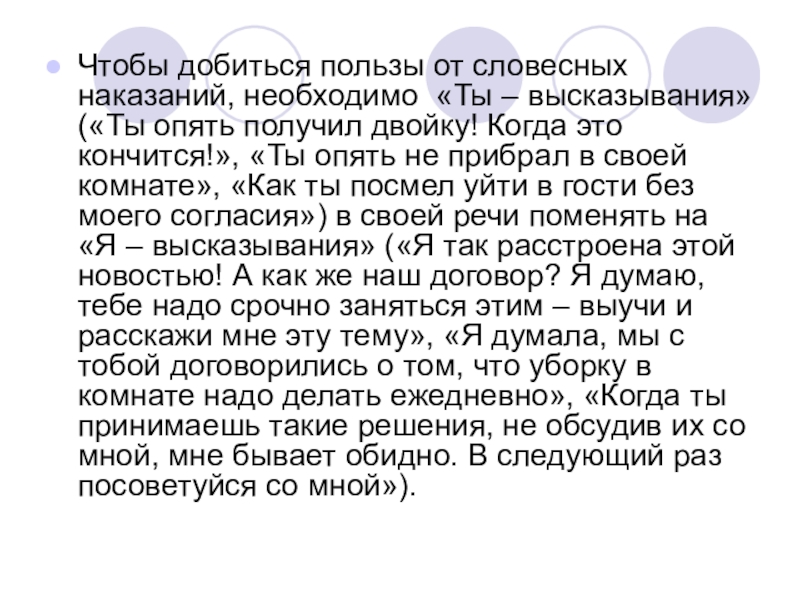 Слайд 13Чтобы добиться пользы от словесных наказаний, необходимо «Ты – высказывания» («Ты