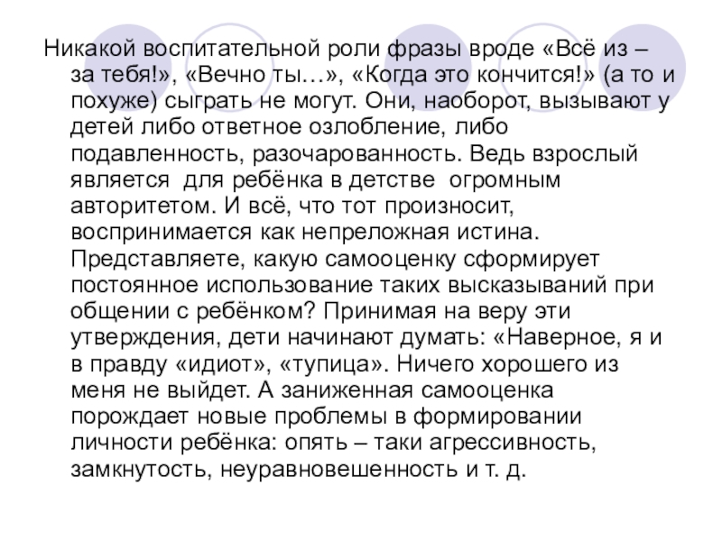ты…», «Когда это кончится!» (а то и похуже) сыграть не могут. Они, наоборот, вызывают у детей либо ответное озлобление, либо подавленность, разочарованность. Ведь взрослый является для ребёнка в детстве огромным авторитетом. И всё, что тот произносит, воспринимается как непреложная истина. Представляете, какую самооценку сформирует постоянное использование таких высказываний при общении с ребёнком? Принимая на веру эти утверждения, дети начинают думать: «Наверное, я и в правду «идиот», «тупица». Ничего хорошего из меня не выйдет. А заниженная самооценка порождает новые проблемы в формировании личности ребёнка: опять – таки агрессивность, замкнутость, неуравновешенность и т. д.