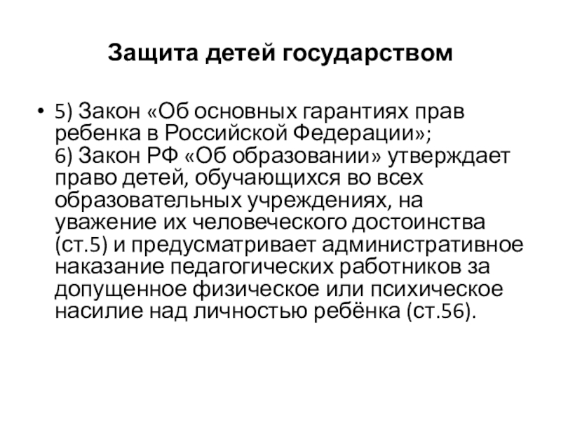 6) Закон РФ «Об образовании» утверждает право детей, обучающихся во всех образовательных учреждениях, на уважение их человеческого достоинства (ст.5) и предусматривает административное наказание педагогических работников за допущенное физическое или психическое насилие над личностью ребёнка (ст.56).