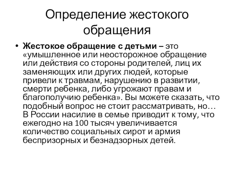 обращение или действия со стороны родителей, лиц их заменяющих или других людей, которые привели к травмам, нарушению в развитии, смерти ребенка, либо угрожают правам и благополучию ребенка». Вы можете сказать, что подобный вопрос не стоит рассматривать, но… В России насилие в семье приводит к тому, что ежегодно на 100 тысяч увеличивается количество социальных сирот и армия беспризорных и безнадзорных детей.