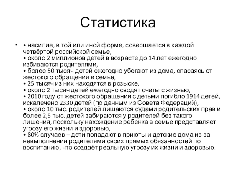 • 2010 году от жестокого обращения с детьми погибло 1914 детей, искалечено 2330 детей (по данным из Совета Федераций),