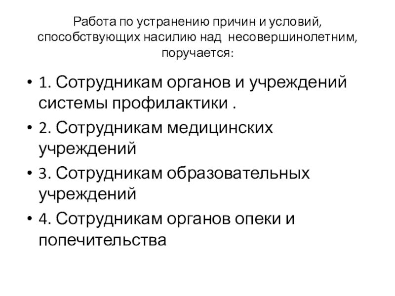 Слайд 5Работа по устранению причин и условий, способствующих насилию над несовершинолетним,поручается: