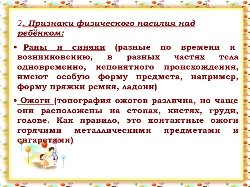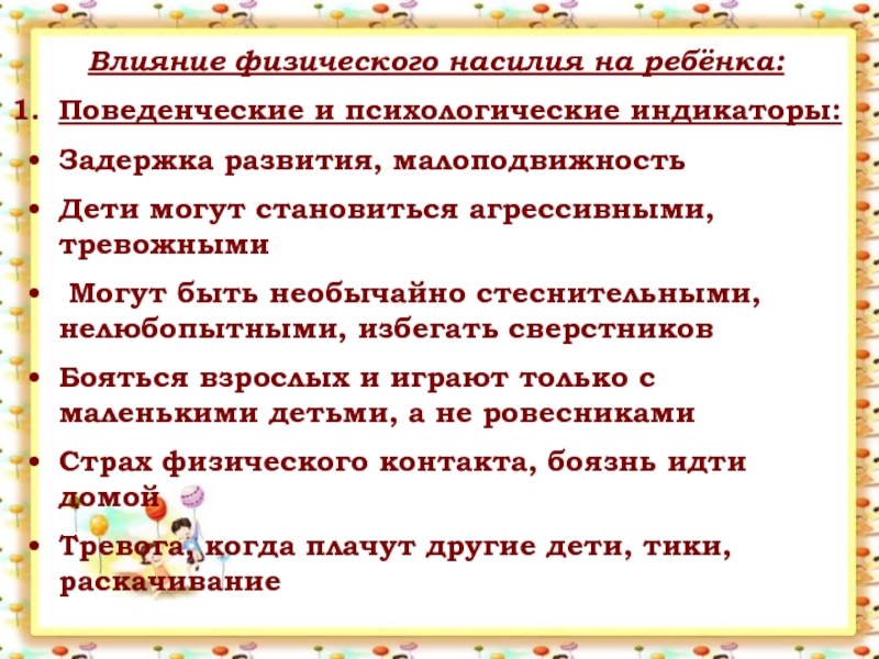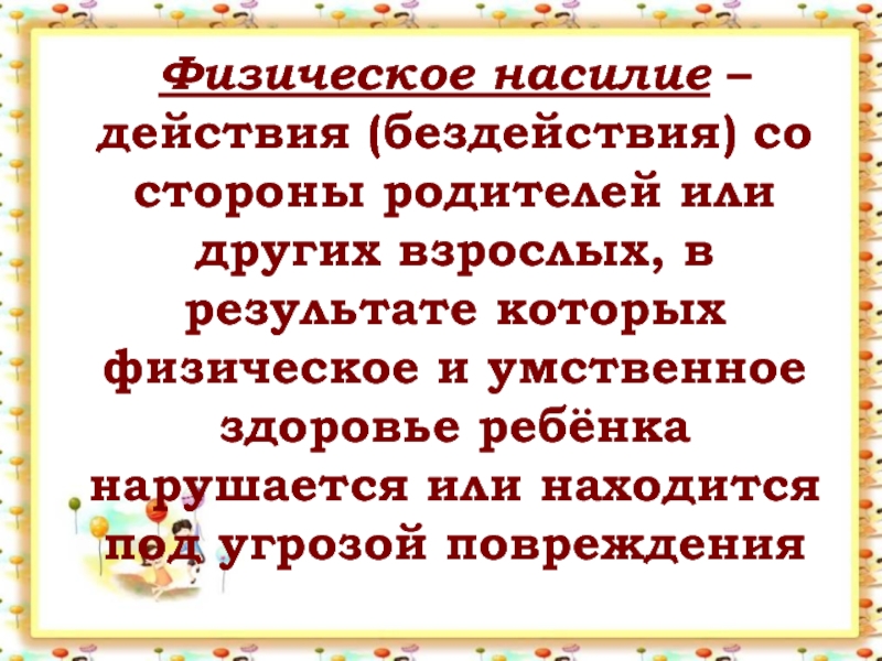 Слайд 7Физическое насилие – действия (бездействия) со стороны родителей или других взрослых,