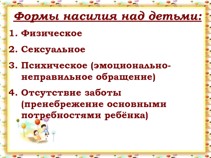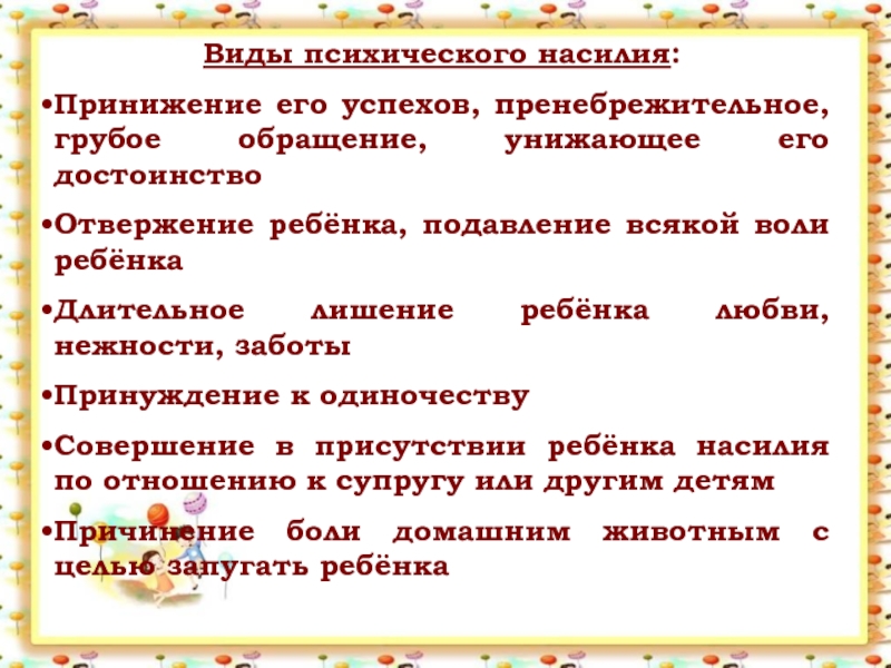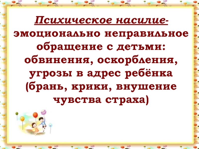 Слайд 13Психическое насилие- эмоционально неправильное обращение с детьми: обвинения, оскорбления, угрозы в