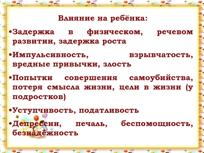 адрес ребёнка (брань, крики, внушение чувства страха)