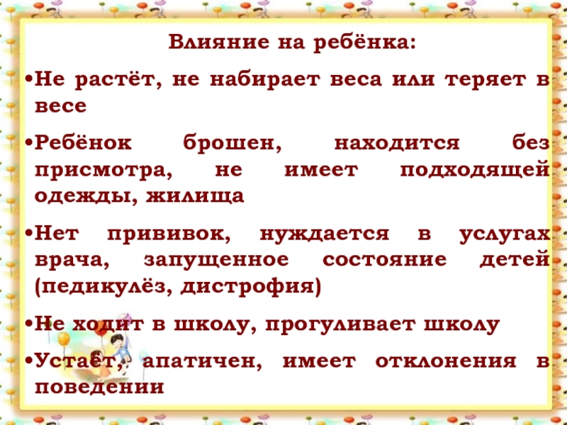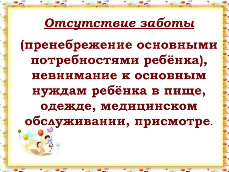 (пренебрежение основными потребностями ребёнка), невнимание к основным нуждам ребёнка