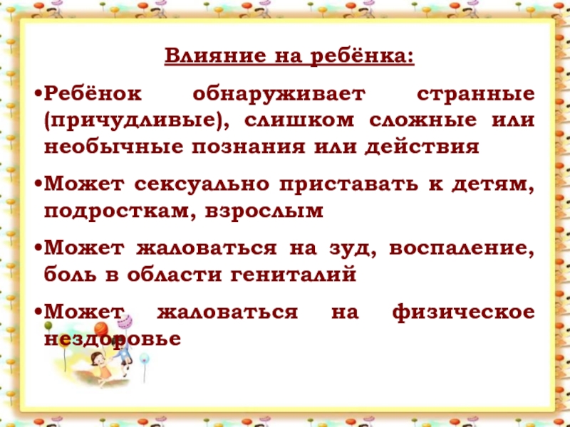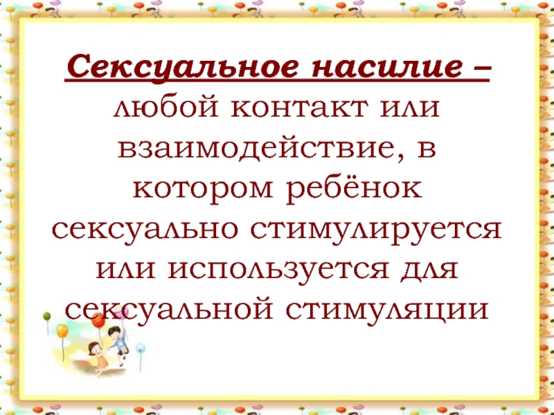 Слайд 11Сексуальное насилие – любой контакт или взаимодействие, в котором ребёнок сексуально