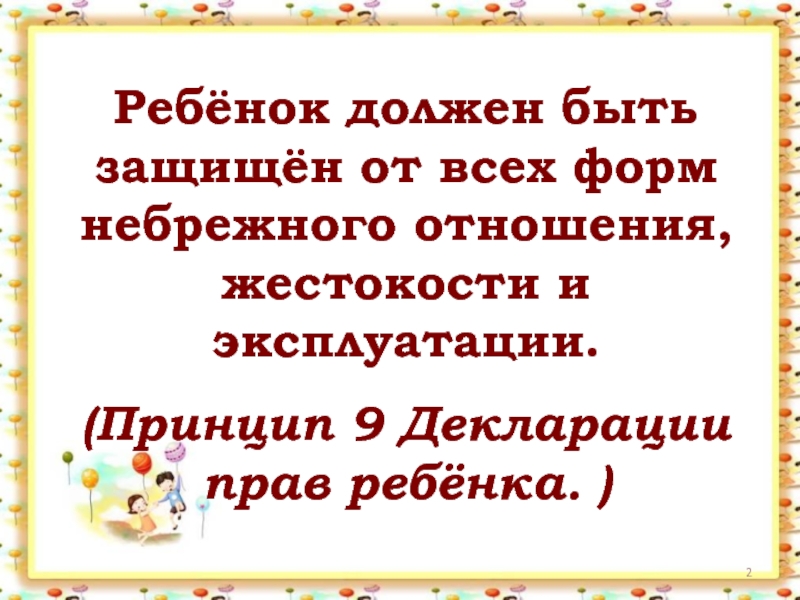 Слайд 2Ребёнок должен быть защищён от всех форм небрежного отношения, жестокости и