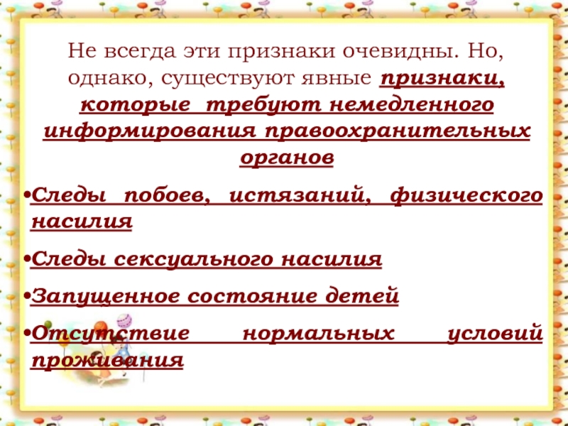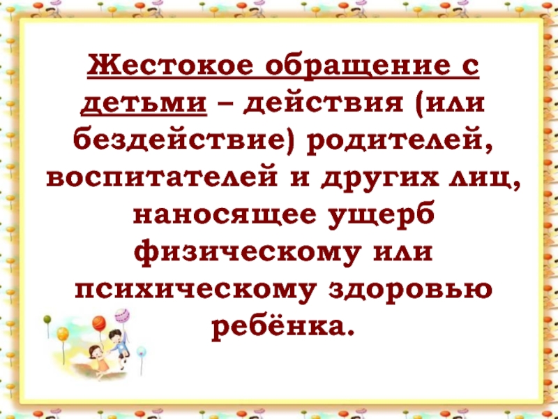 Слайд 3Жестокое обращение с детьми – действия (или бездействие) родителей, воспитателей и