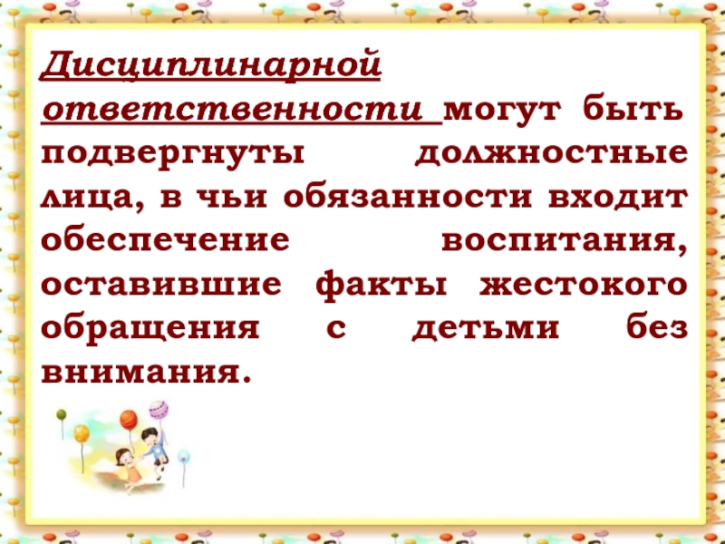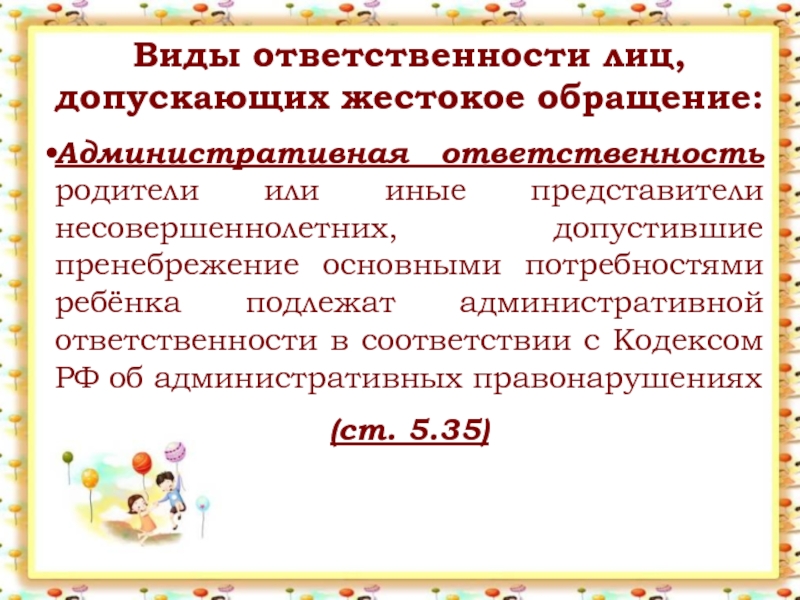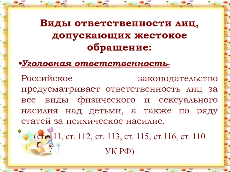 Слайд 23Виды ответственности лиц, допускающих жестокое обращение: