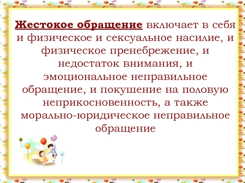 Слайд 4Жестокое обращение включает в себя и физическое и сексуальное насилие, и