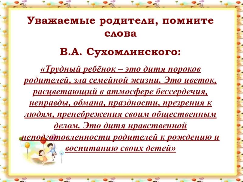 родителей, зла семейной жизни. Это цветок, расцветающий в атмосфере бессердечия, неправды, обмана, праздности, презрения к людям, пренебрежения своим общественным делом. Это дитя нравственной неподготовленности родителей к рождению и воспитанию своих детей»