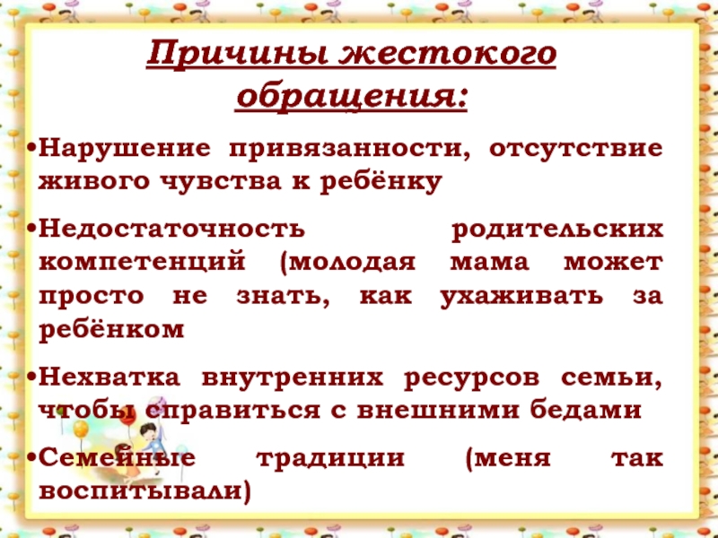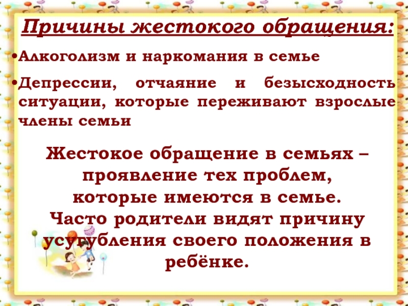 Жестокое обращение в семьях – проявление тех проблем, которые имеются в семье. Часто родители видят причину усугубления своего положения в ребёнке.