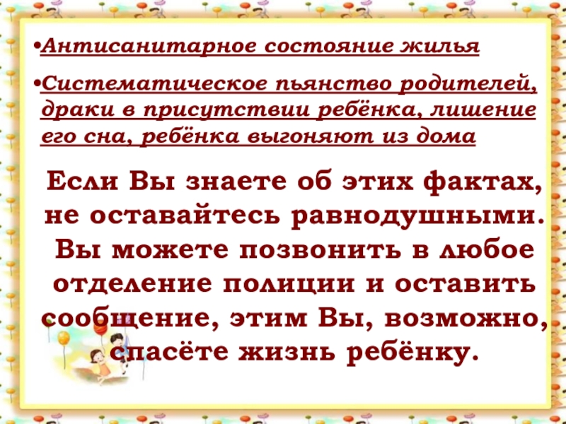 Если Вы знаете об этих фактах, не оставайтесь равнодушными. Вы можете позвонить в любое отделение полиции и оставить сообщение, этим Вы, возможно, спасёте жизнь ребёнку.