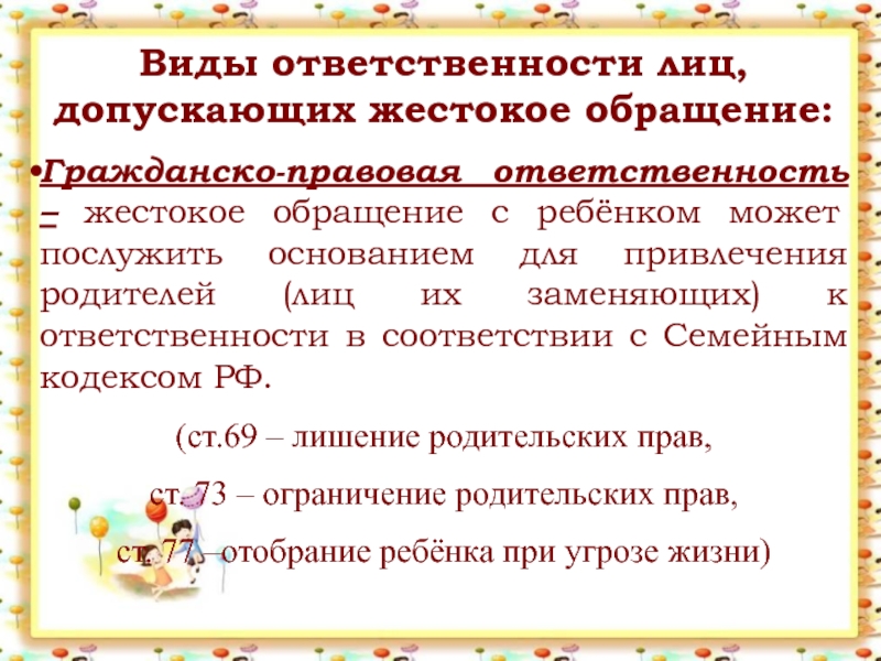 Слайд 24Виды ответственности лиц, допускающих жестокое обращение: