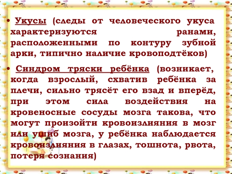 Синдром тряски ребёнка (возникает, когда взрослый, схватив ребёнка за плечи, сильно трясёт его взад и вперёд, при этом сила воздействия на кровеносные сосуды мозга такова, что могут произойти кровоизлияния в мозг или ушиб мозга, у ребёнка наблюдается кровоизлияния в глазах, тошнота, рвота, потеря сознания)