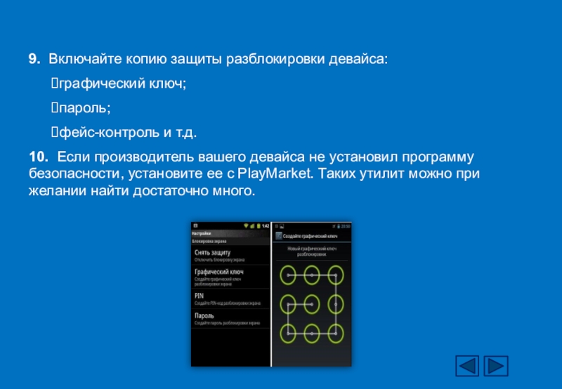 Слайд 139. Включайте копию защиты разблокировки девайса: