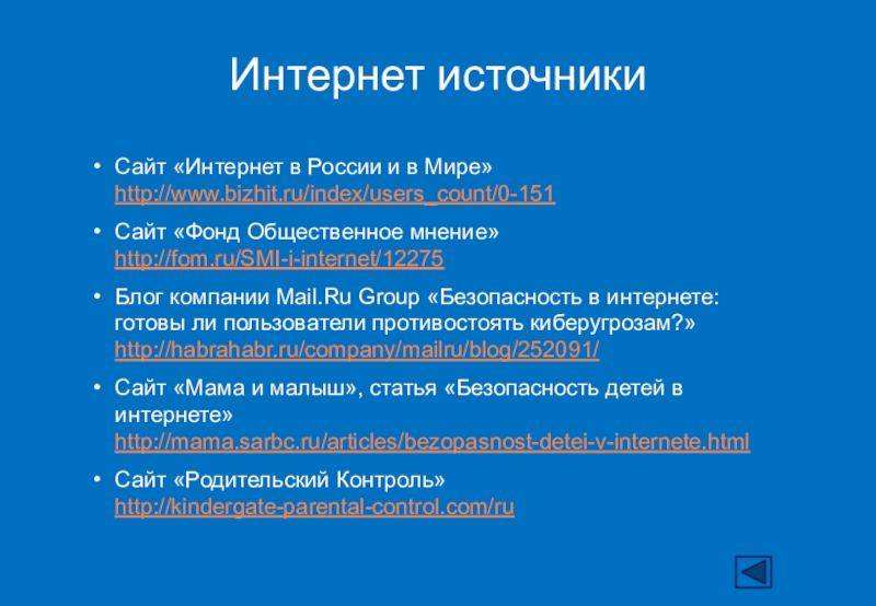Сайт «Мама и малыш», статья «Безопасность детей в интернете» http://mama.sarbc.ru/articles/bezopasnost-detei-v-internete.html