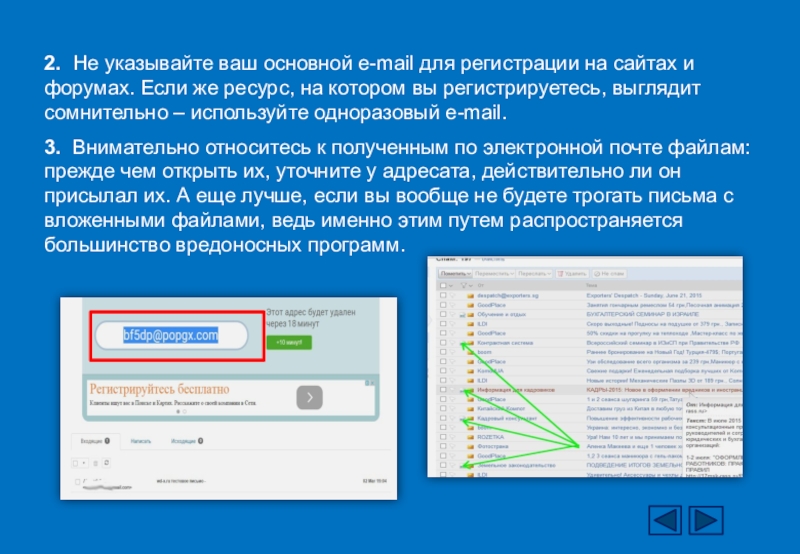 Слайд 102. Не указывайте ваш основной e-mail для регистрации на сайтах и