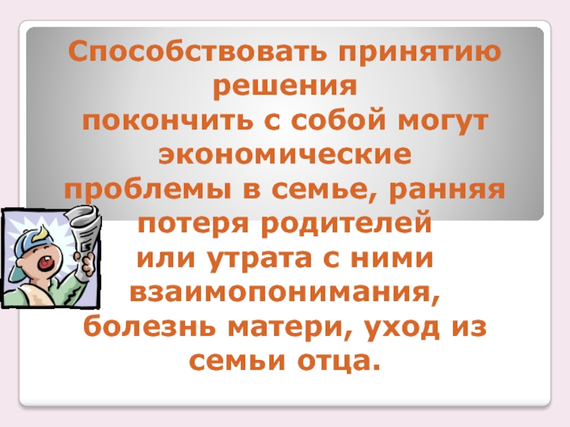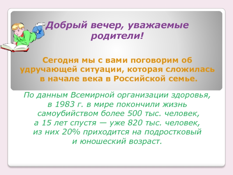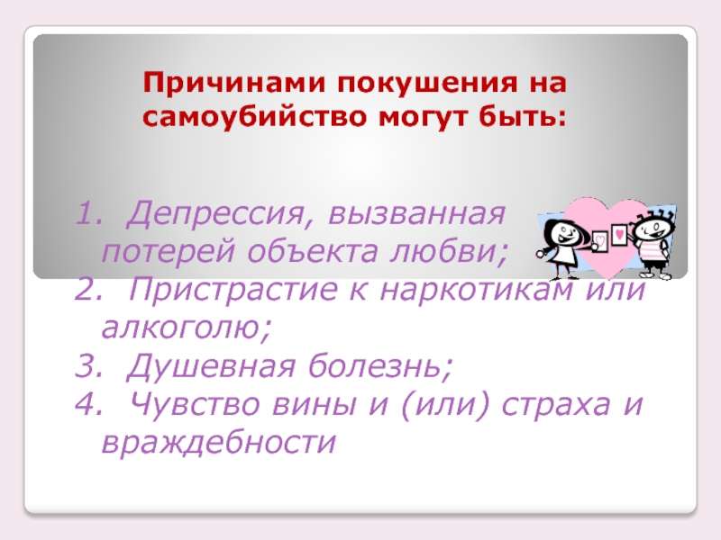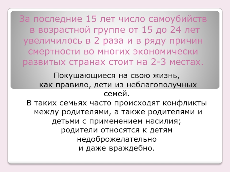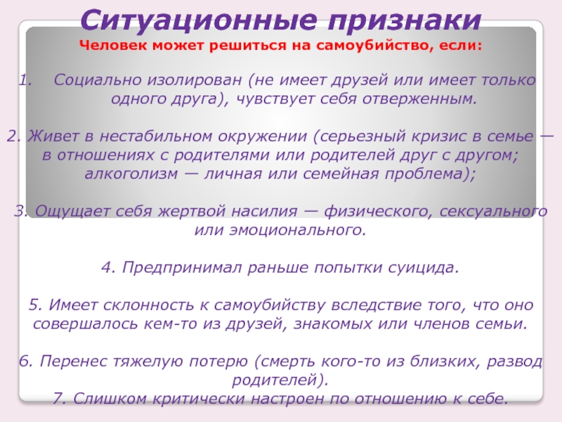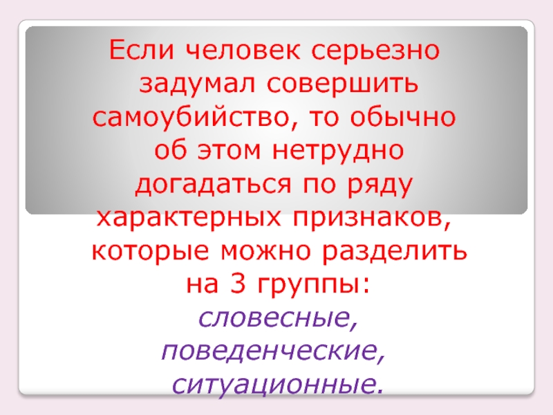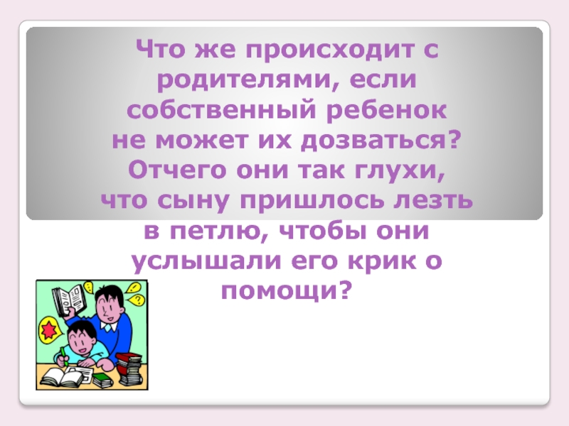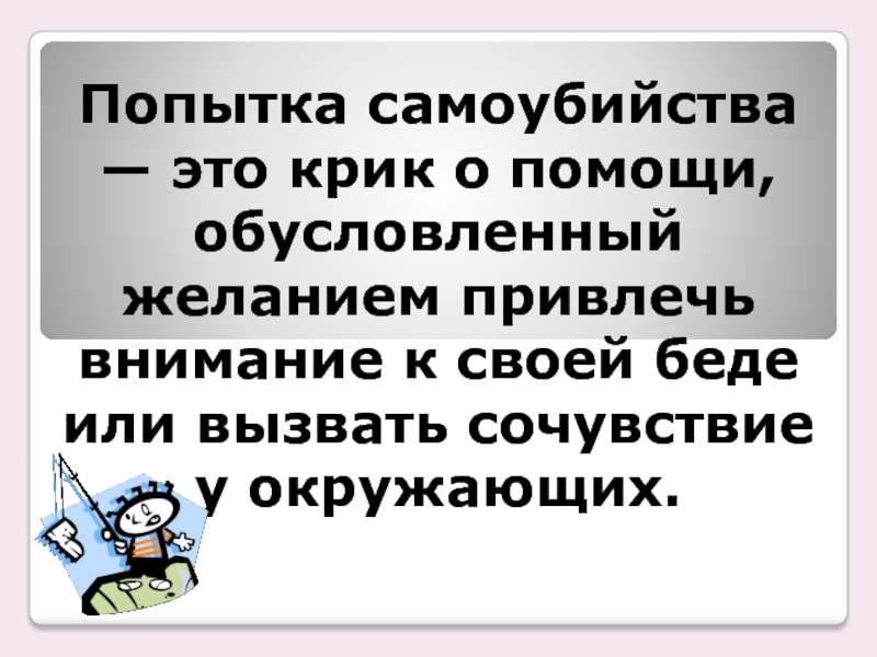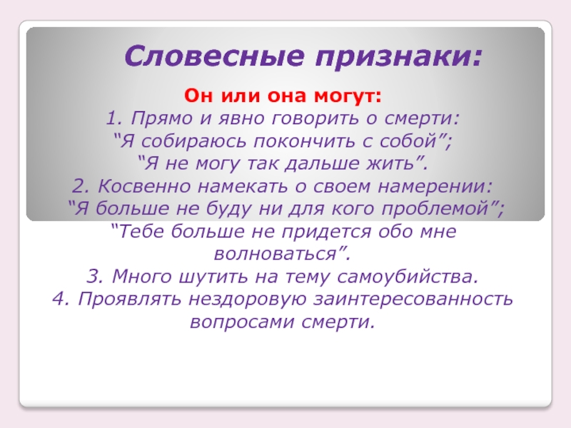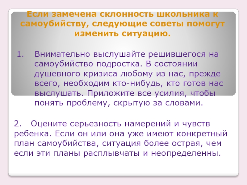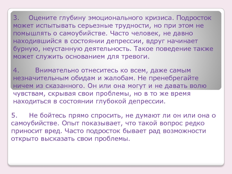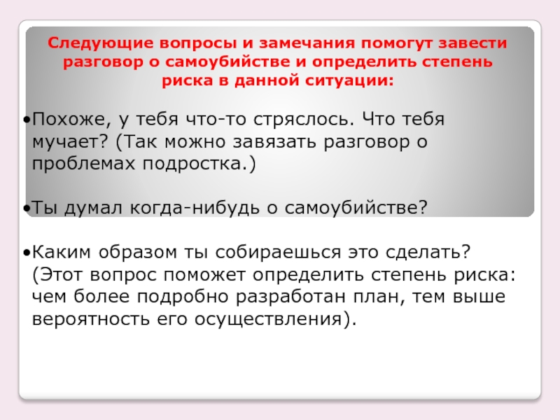 самоубийстве. Опыт показывает, что такой вопрос редко приносит вред. Часто подросток бывает рад возможности открыто высказать свои проблемы.